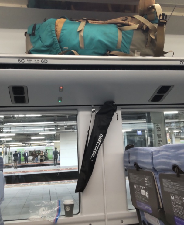 そして、リュックを棚に収める。実は、ここが不安だったけど、あずさの荷物棚はさすがに頑丈だ。