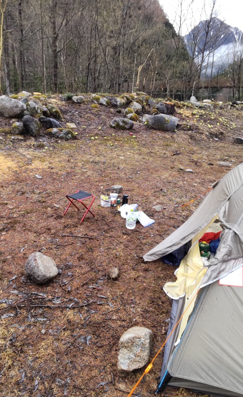 その日の夜は、寝ている内に、背中や足先が冷たくて時々目が覚めた。足を伸ばすとテントの端にあたって、そこが濡れているせいだ。