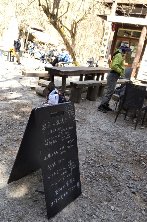 下の真ん中の2つの写真は、明神館の前。岩魚焼き定食1,800円、カレー(並)1,200円。10時15分ころ。