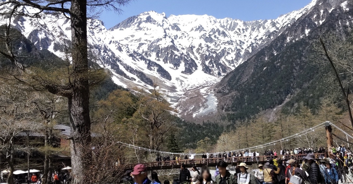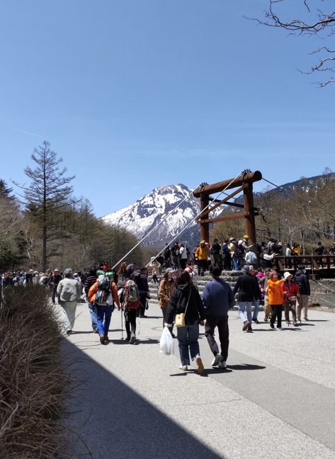 河童橋に着いた。人が多い。残雪の時期の景色はとても迫力がある。うーん、人気なわけだ。